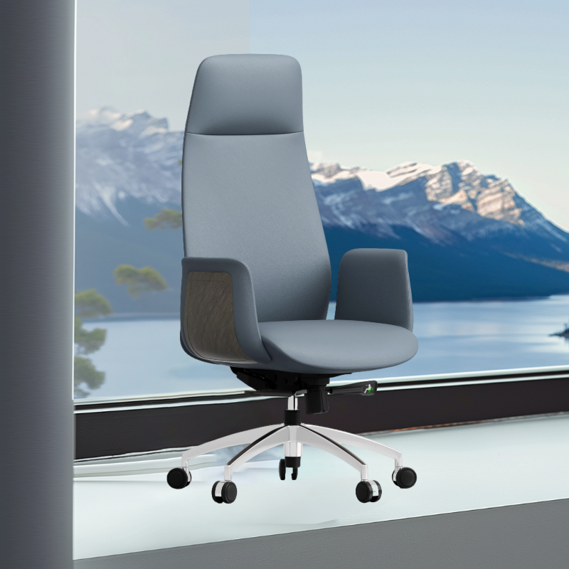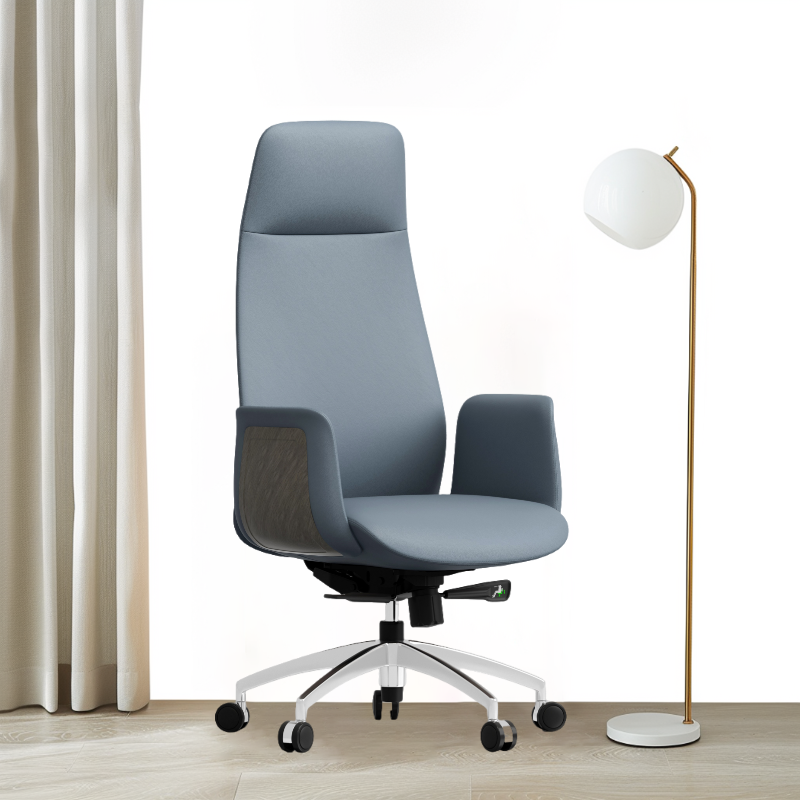 เก้าอี้สำนักงานทำจากหนังฟองน้ำหล่อขึ้นรูปเรียบง่ายสีน้ำเงินเข้มพร้อมพนักพิงศีรษะและล้อเงียบ