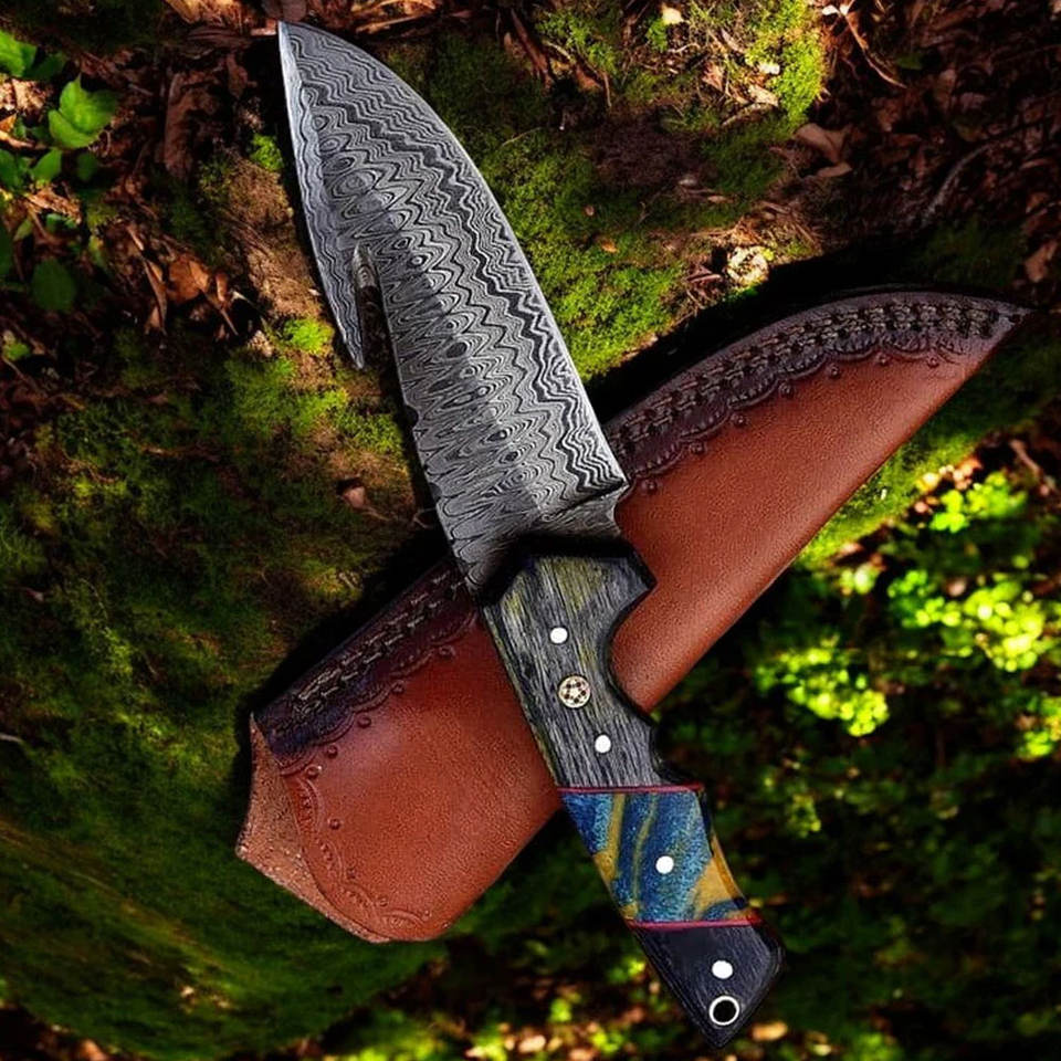 มีดแบบมีตะขอแบบเหล็กดามัสกัสเครื่องมือล่าสัตว์ไม้แปลกใหม่พร้อมด้ามจับเขากวางพร้อมปลอกหนังมีดสกินเนอร์
