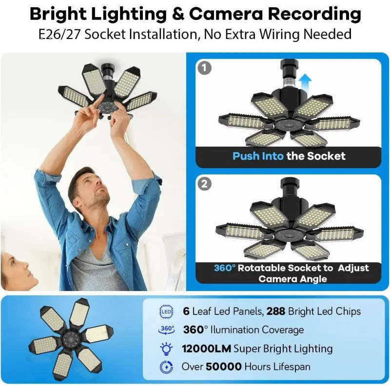 ไฟ LED เหนือศีรษะโรงรถแบบเปลี่ยนรูปได้พร้อมการตรวจสอบความปลอดภัยโคมไฟพับได้สำหรับเวิร์คช็อปกล้อง WiFi