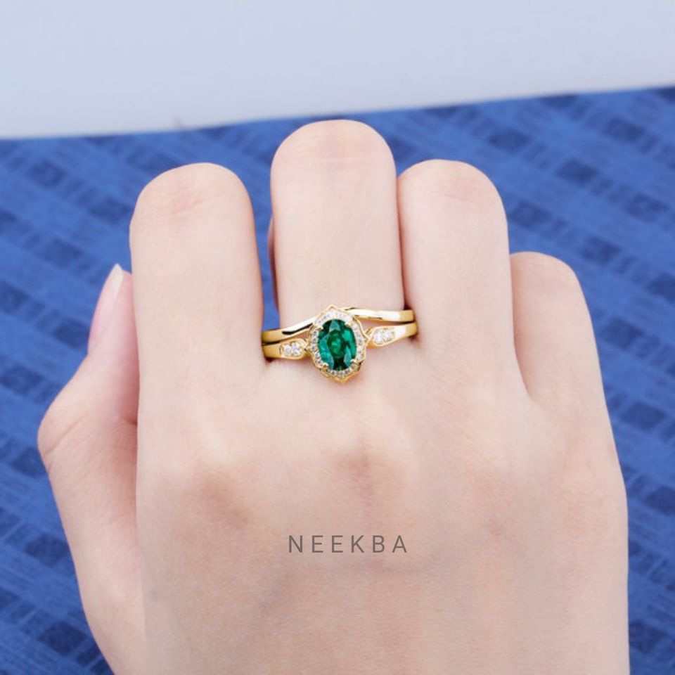 ชุดแหวนเจ้าสาว2ชิ้นมรกตละเอียดอ่อน-แหวนหมั้นมรกตโตรูปวงรีในห้องปฏิบัติการจับคู่กับแหวนแต่งงานสีเงิน925