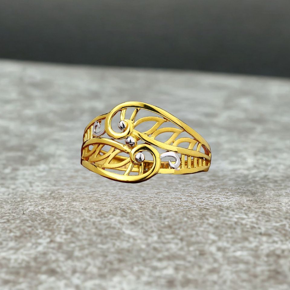 แหวนทองรูปใบไม้ซ้อนชั้นละเอียดอ่อน | การตกแต่งแบบสองสีและลวดลายแบบนามธรรม | เครื่องประดับน้ำหนักเบา 2.150 กรัม