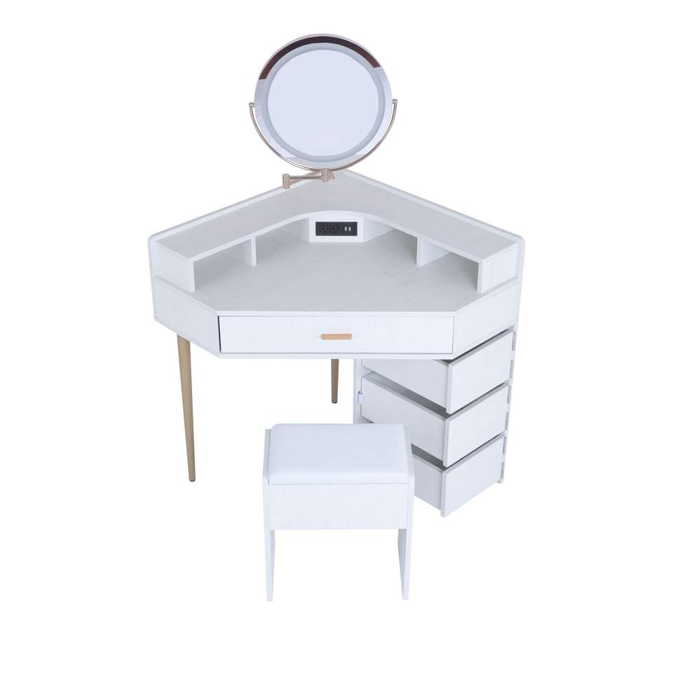 โต๊ะเครื่องแป้งกระจกแบบพกพาพร้อมที่เก็บของและเก้าอี้มีล้อเลื่อน พร้อมพอร์ต USB สำหรับแต่งหน้าในห้องนอน