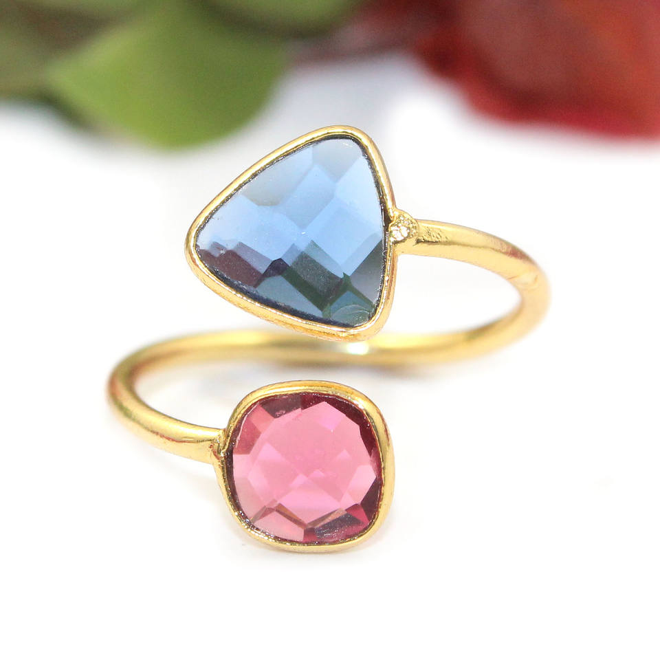 พลอยพลอยทัวร์มาลีนสีฟ้าและพลอยสามสีแดงดีไซน์ดีไซน์เนอร์ประดับหินควอตซ์สองชั้น22K ชุบทอง