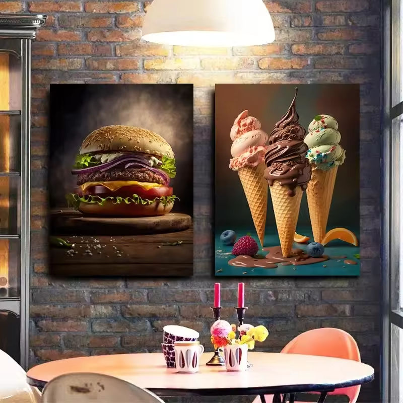 แฮมเบอร์เกอร์พิซซ่าสไตล์สตรีทฟู้ดแสนอร่อยสำหรับสุนัขร้อนไอศกรีมศิลปะผนังห้องครัวร้านอาหารหรือของตกแต่งบ้าน