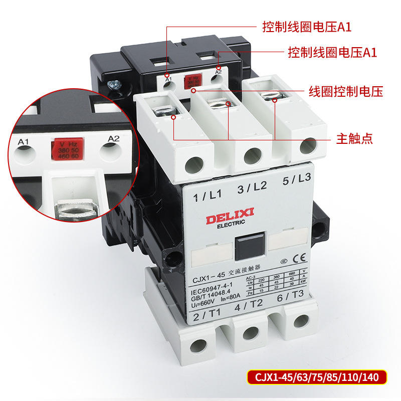 คอนแทคเตอร์ไฟฟ้ากระแสสลับ Delixi รุ่น CJX1 สำหรับมอเตอร์สามเฟส รองรับกระแสไฟฟ้าตั้งแต่ 45 แอมป์ ถึง 205 แอมป์ แรงดันไฟฟ้า 220 โวลต์ และ 380 โวลต์
