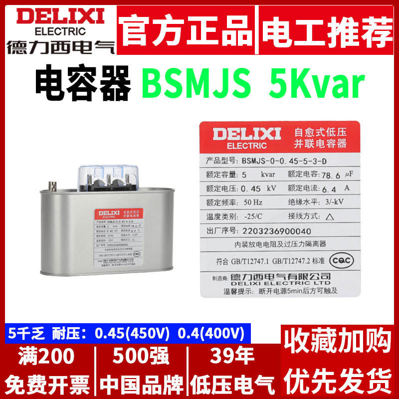 Delixi ตัวเก็บประจุ BSMJS-0.45-5-3-D 450V/400V ตู้ชดเชยแรงดันไฟฟ้าต่ำ5Kvar
