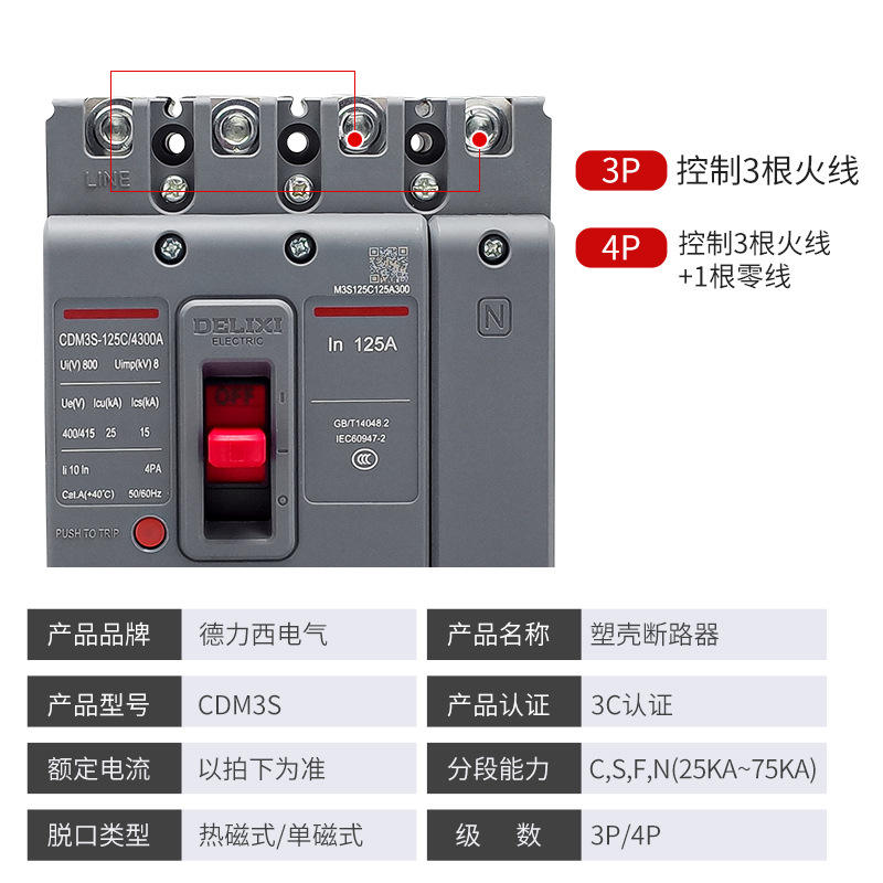 Delixi CDM3S-1250F/4300 1000A 1250A สามเฟสสี่สาย4P เบรกเกอร์