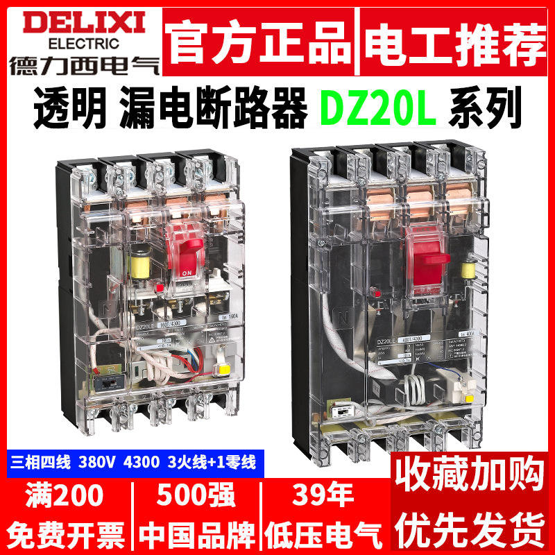 เบรกเกอร์ป้องกันกระแสไฟฟ้ารั่วไหลแบบโปร่งใส Delixi DZ20L สำหรับระบบสามเฟสสี่สาย