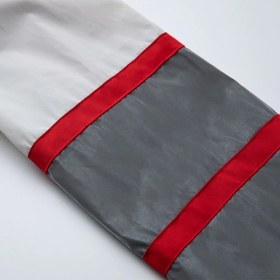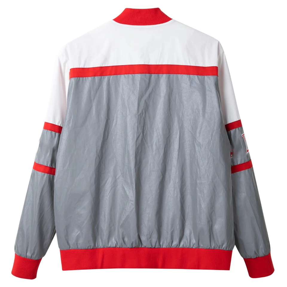 เสื้อแจ็คเก็ตบอมเบอร์แบบสะท้อนแสง Delta 3M แบบกลับด้านได้ พรีเมียม กันน้ำ สไตล์ Urban Varsity สีเทาและสีแดง พร้อมโลโก้ด้านหน้าแบบกำหนดเอง
