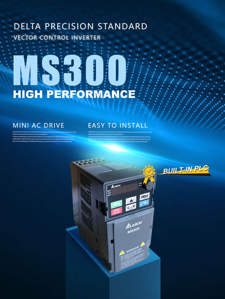 อินเวอร์เตอร์ Delta MS300 ซีรีส์ VFD2A8MS21ANSAA สำหรับมอเตอร์ AC กำลัง 0.4 กิโลวัตต์ 230 โวลต์ 1 เฟส ระบบควบคุมความถี่แปรผัน