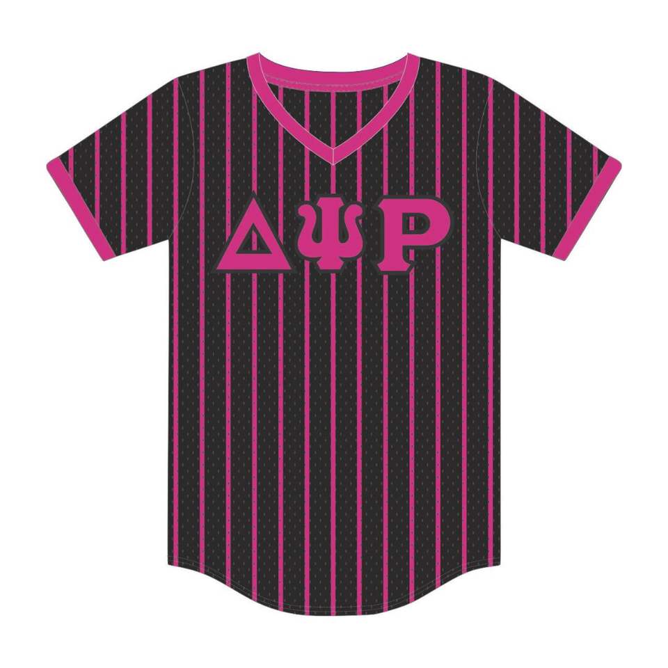 Delta PSI Rho sorority สีดำ pinstripe เสื้อเบสบอลเสื้อตาข่ายโพลีเอสเตอร์คอวีพร้อมเติมเต็มช่องว่างเย็บปักถักร้อย