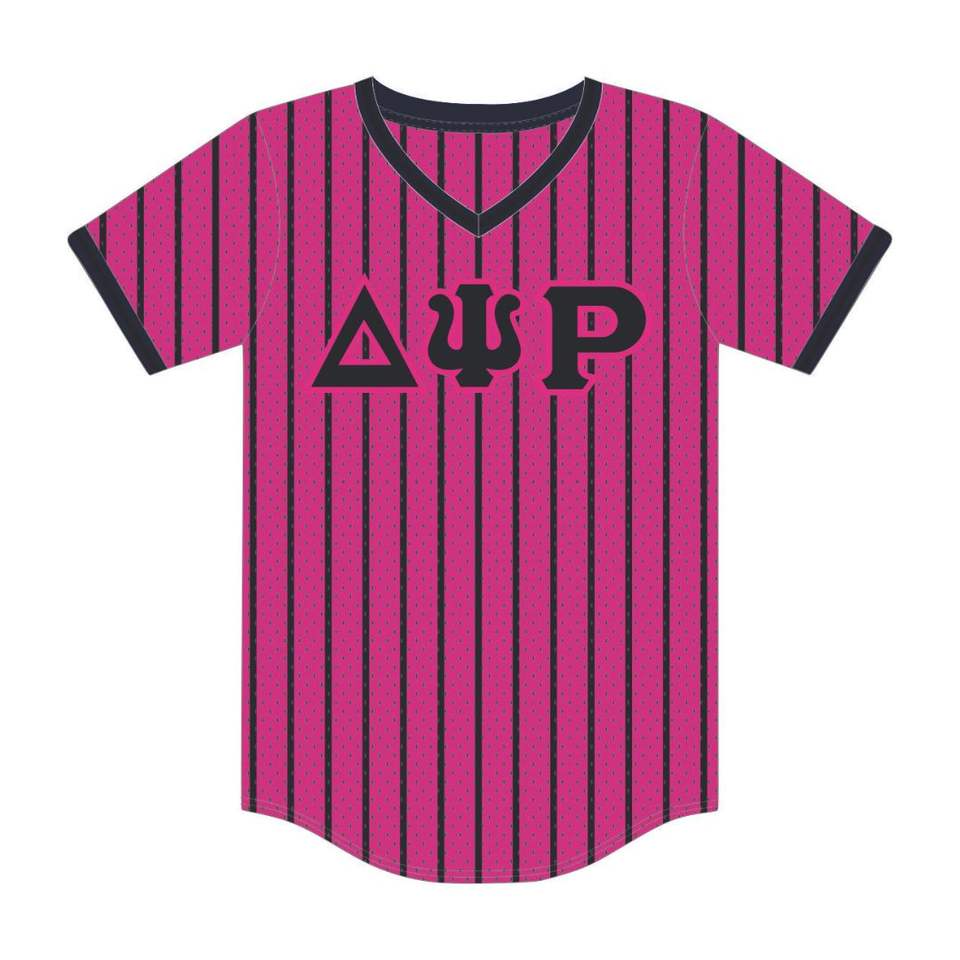 Delta PSI Rho sorority เสื้อเบสบอลสวมหัว pinstripe สีชมพูเสื้อยืดโพลีเอสเตอร์ตาข่ายคอวีพร้อมเติมเต็มช่องว่างเย็บปักถักร้อย
