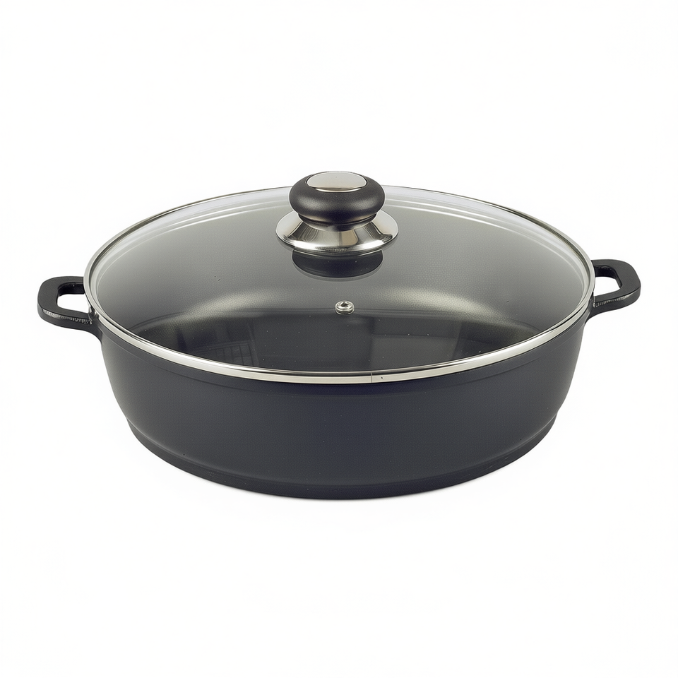 กระทะเดลต้า 28 ซม. กระทะย่างอะลูมิเนียมหล่อพร้อมฝาแก้ว ด้ามจับสแตนเลส ทนทาน