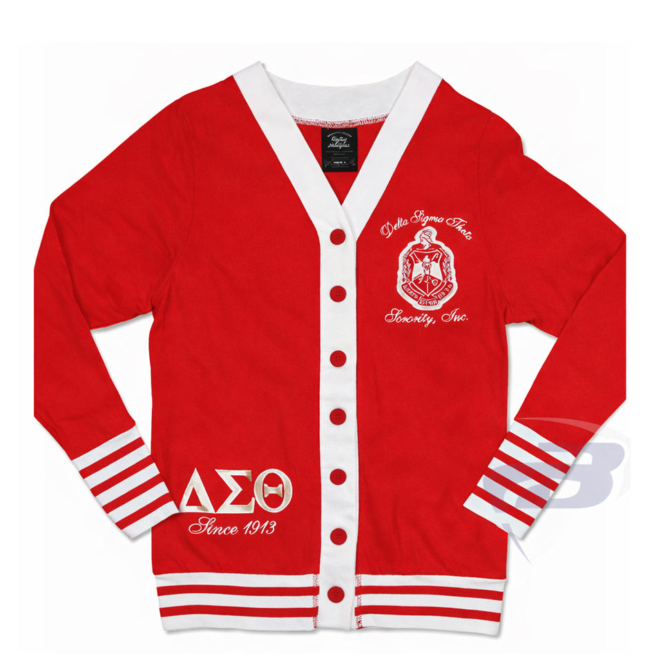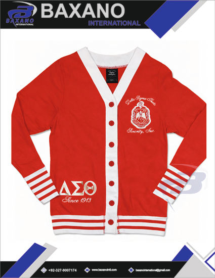 เสื้อสเวตเตอร์ไหมพรมปักลายตัวอักษรกรีกแบบติดกระดุมสำหรับชมรมเดลต้า ซิกมา ตีต้า สำหรับฤดูหนาว สไตล์วินเทจ