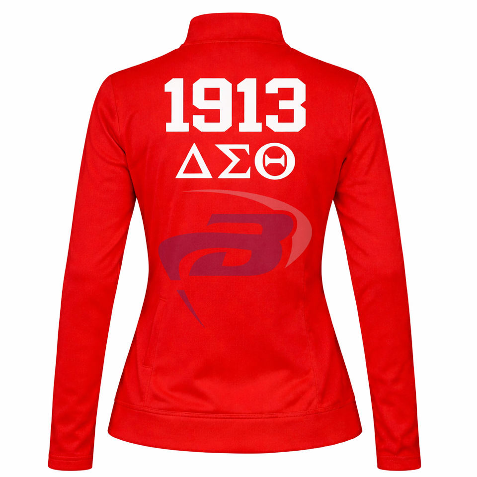 เสื้อยืดฤดูหนาวแบบซิปเต็มตัวสีแดงสำหรับสตรีไซส์ใหญ่ ลายตัวอักษรกรีก Bold 1913 ของชมรมเดลต้า ซิกมา ทีตา แบบลำลอง