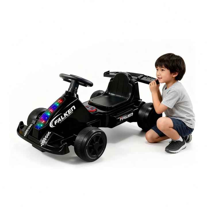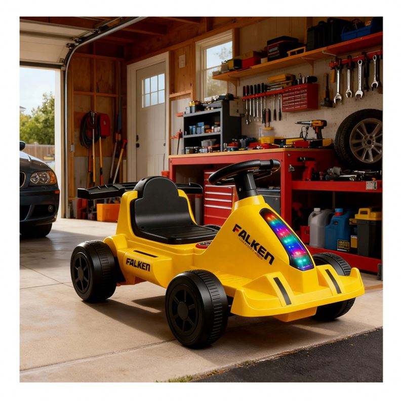 รถของเล่นดนตรีแบบอินเทอร์แอคทีฟสุดหรู พร้อมมอเตอร์คู่ 380 ระบบสตาร์ทด้วยเท้า สีเหลือง ตัวรถทำจากพลาสติก สำหรับเด็กอายุ 2-4 ปี เหมาะสำหรับเล่นในร่ม