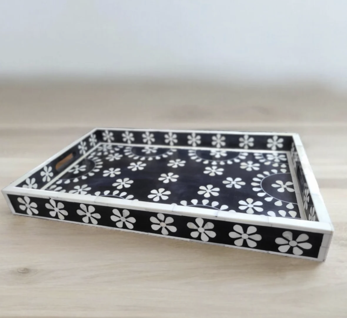 ถาดเสิร์ฟลายดอกไม้ทันสมัยทำมือจากไม้สีขาวฝังกระดูก ยี่ห้อ Tayyab Handicraft ขนาดปรับแต่งได้สำหรับใช้ในครัวเรือน