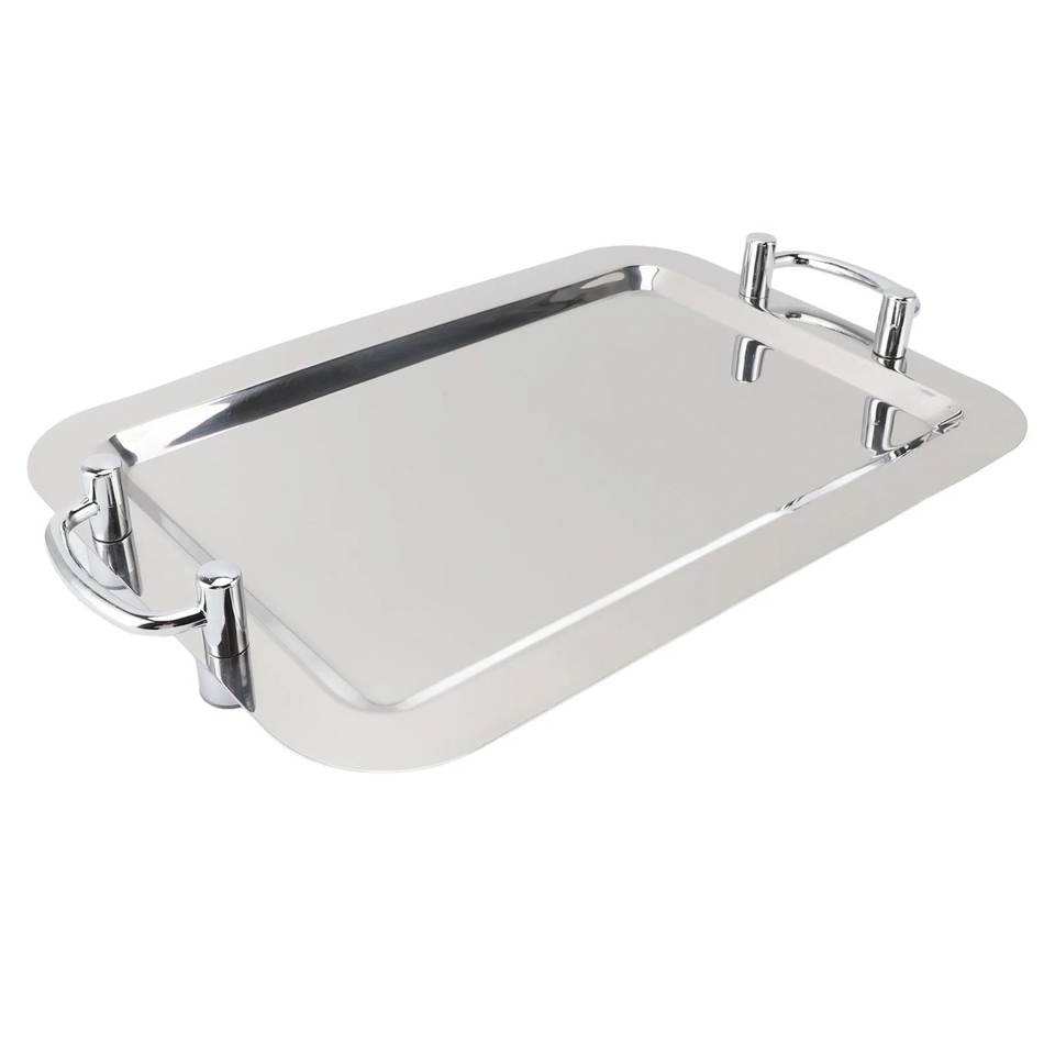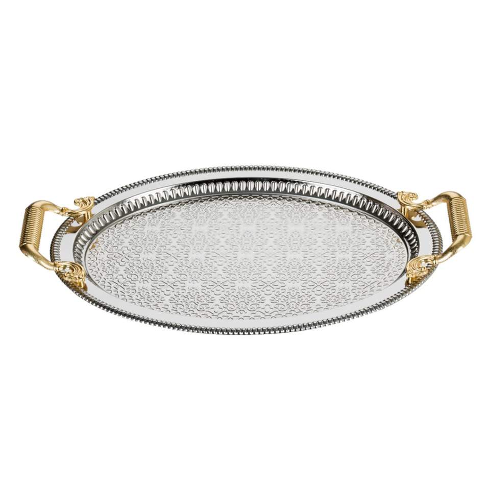 ถาดโลหะสีเงินลายนูนพร้อมด้ามจับสีทองแบบโบราณเครื่องใช้บนโต๊ะอาหารถาดเสิร์ฟอาหารของว่าง
