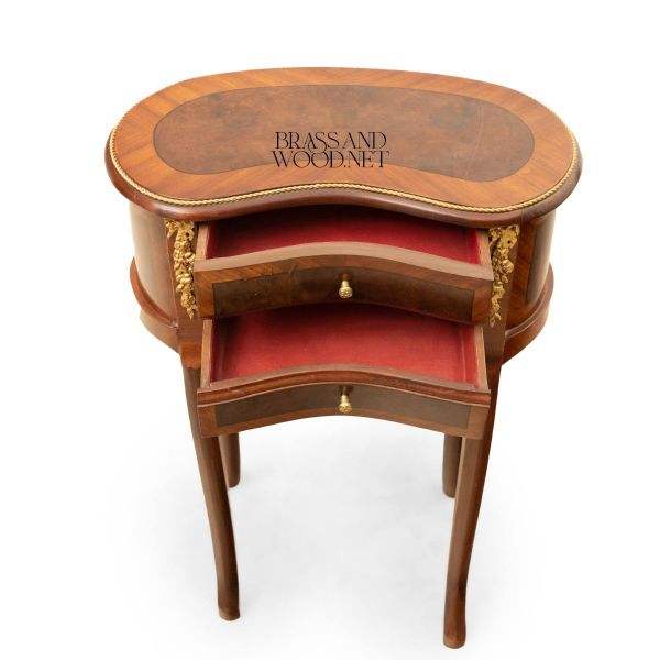 โต๊ะคอนโซลไม้ทรงเดมิลูน พร้อมลิ้นชักสองชั้น ท็อปฝังลาย ขาโค้ง แต่งด้วยทองเหลือง ดีไซน์สไตล์ฝรั่งเศสคลาสสิก