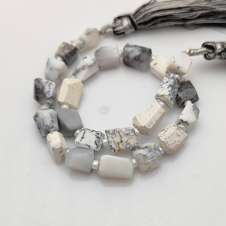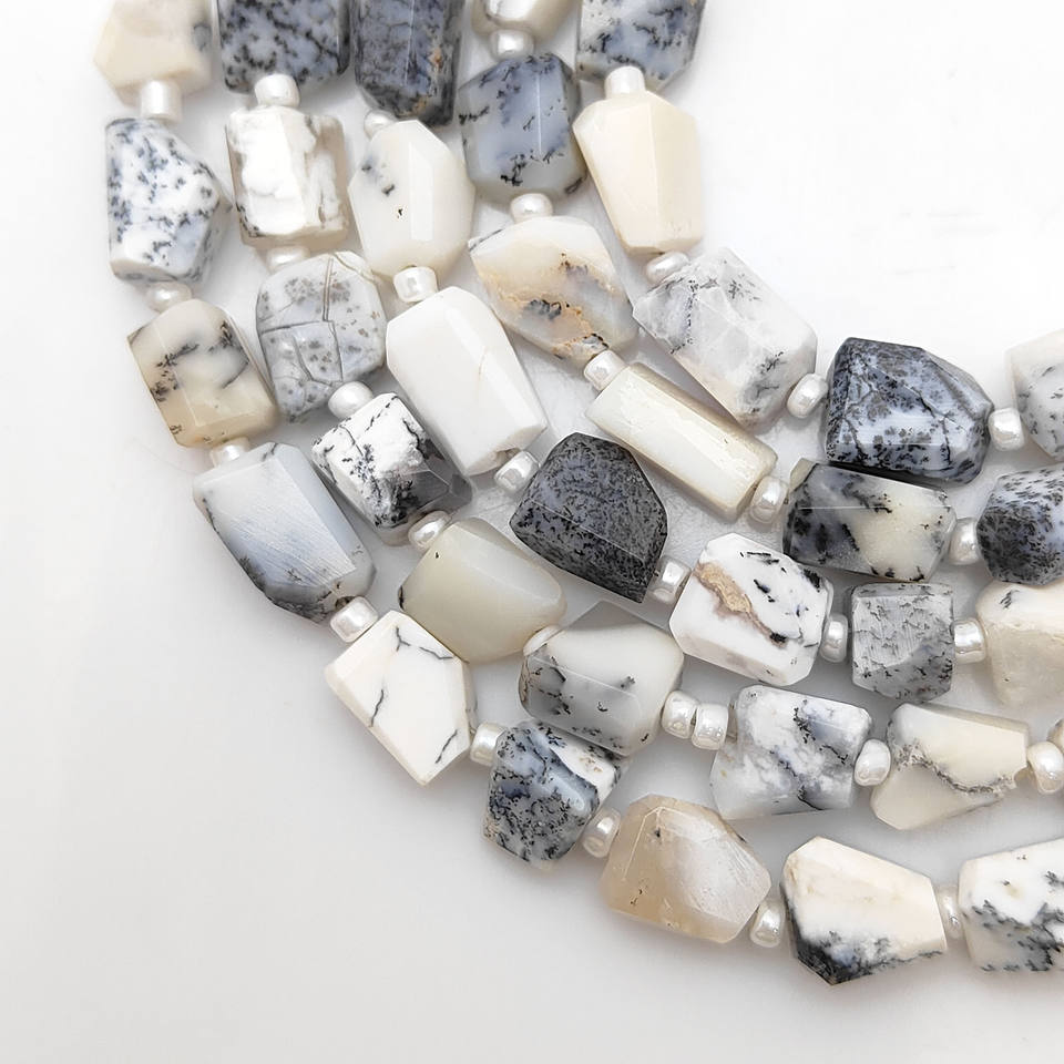 ลูกปัดโอปอลเดนไดรต์ทรงนักเก็ตขนาด 10-12 มม. ลูกปัดทรงนักเก็ตเจียระไนเป็นรูปทรง ร้อยเป็นเส้นสำหรับทำเครื่องประดับ โอปอลเดนไดรต์จำนวนมาก 18-20 เม็ดต่อเส้นยาว 8 นิ้ว