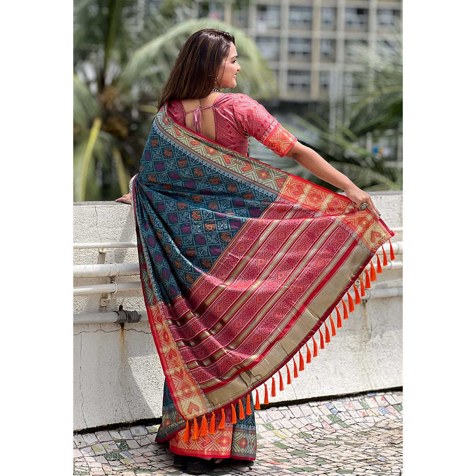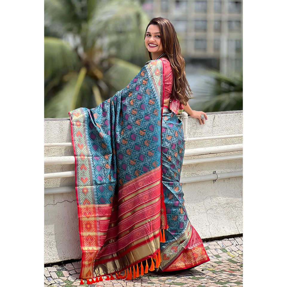 ผ้าไหมพิมพ์ลายมีนาคารีสีน้ำเงินเดนิมเนื้อนุ่มแบบอีลิทวีฟส์ ผ้าซารีทอแบบซารี ชุดราตรีสุดหรู