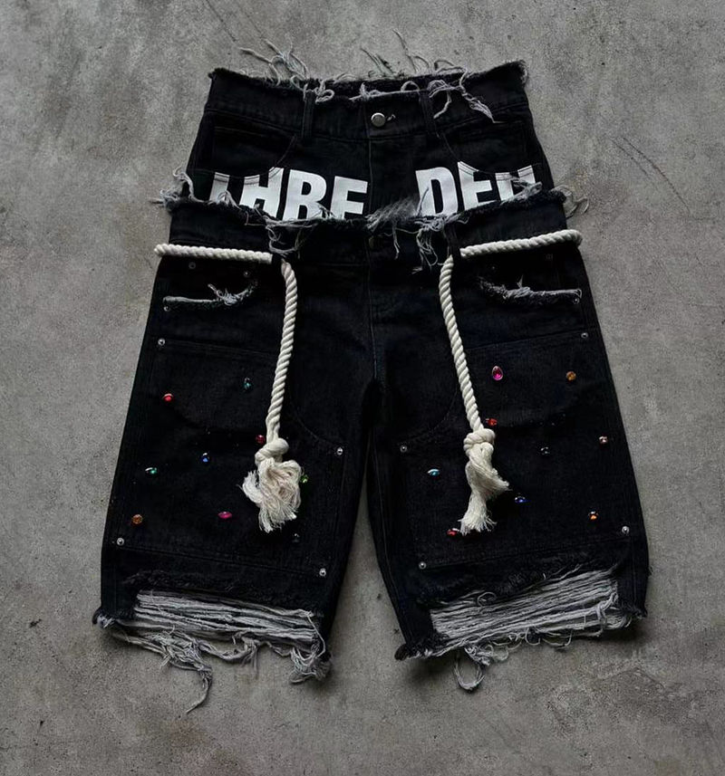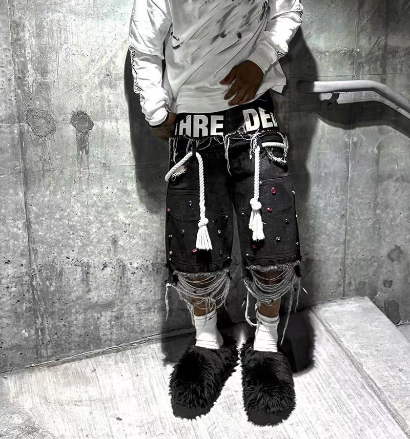 ผู้ผลิตกางเกงยีนส์ กางเกงยีนส์ขาสั้นทรงคาร์โก้แบบหลวมประดับเพชรที่เข่าและเอวสองชั้น กางเกงยีนส์ขาสั้นผู้ชายสั่งทำได้ ราคาถูก