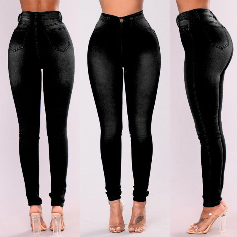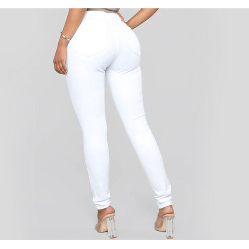 กางเกงยีนส์ระบายอากาศของผู้หญิงแฟชั่นฤดูใบไม้ร่วงเอวสูงปานกลางผ้ายืดสีฟ้าอ่อนกางเกงยีนส์เลกกิ้ง