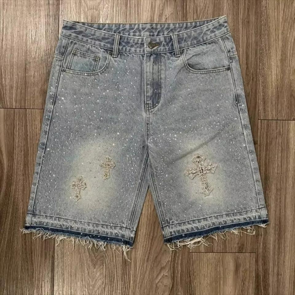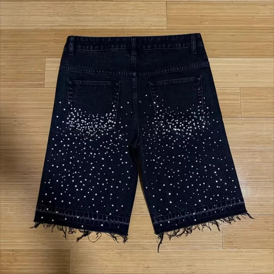 ผู้ผลิตเสื้อผ้ากางเกงยีนส์ขาสั้น กางเกงยีนส์ขาสั้นสไตล์สตรีทแวร์แบบกำหนดเอง กางเกงยีนส์ขาสั้นวินเทจประดับเพชร กางเกงยีนส์ขาสั้นขอบดิบประดับเพชร