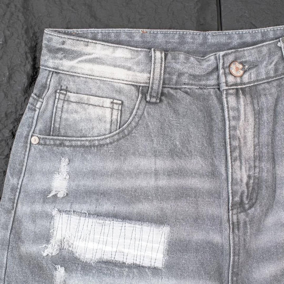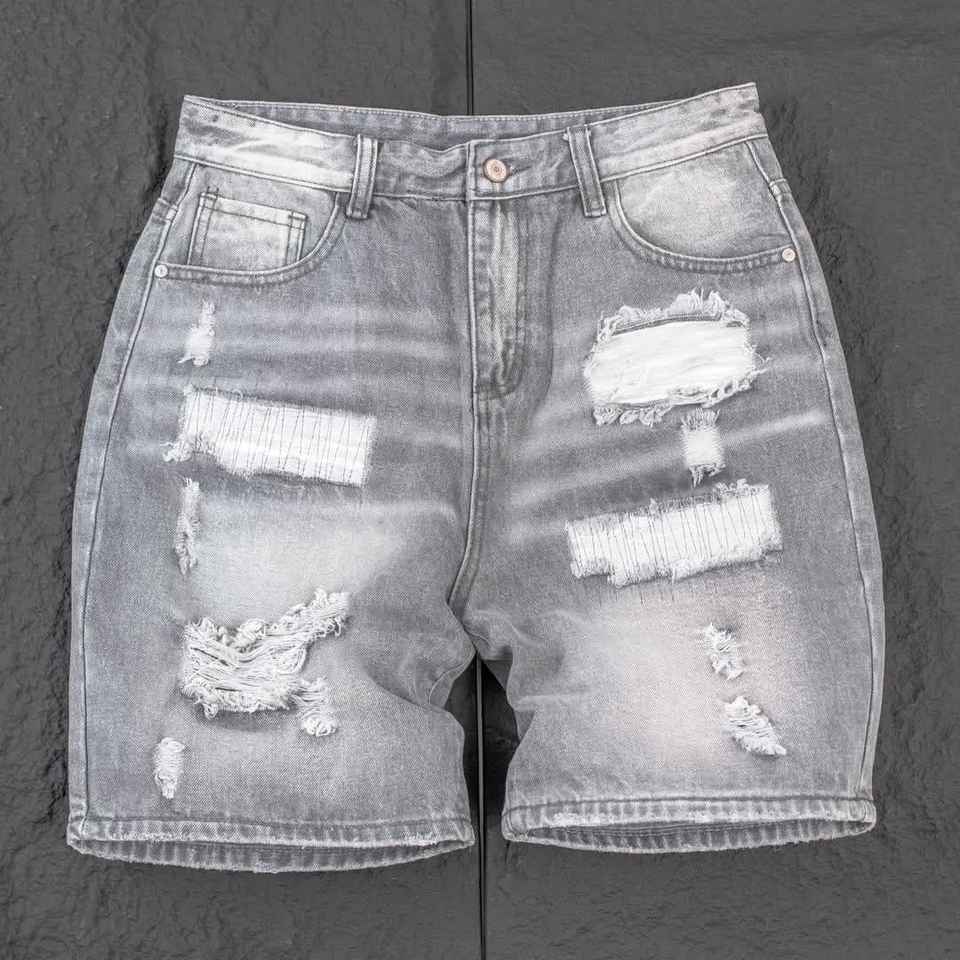 กางเกงยีนส์ขาสั้นผู้ชายแบบทำสีซีดขอบดิบ กางเกงยีนส์ขาสั้นทรงหลวมสไตล์สตรีทแวร์ กางเกงยีนส์ขาสั้นปักโลโก้ตามสั่ง