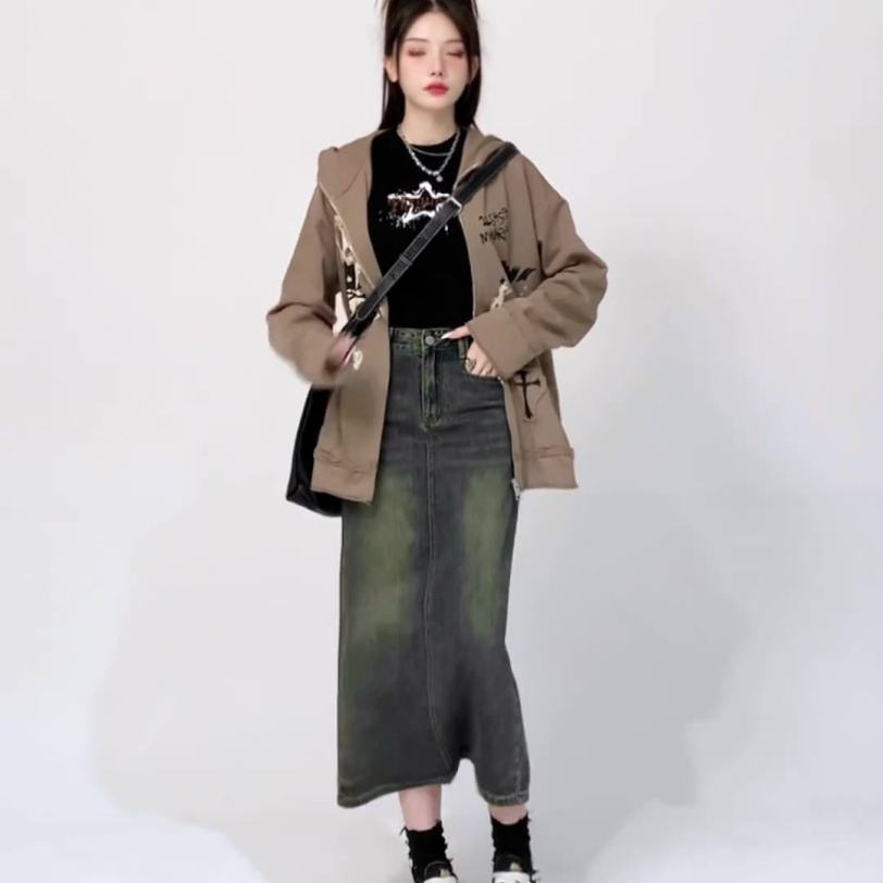 กระโปรงยีนส์ผู้หญิงทรงเอวสูงผ่าข้าง รุ่นใหม่สำหรับฤดูใบไม้ผลิ ช่วยพรางหุ่นให้ดูเพรียวบาง กระโปรงยาวทรงเอ