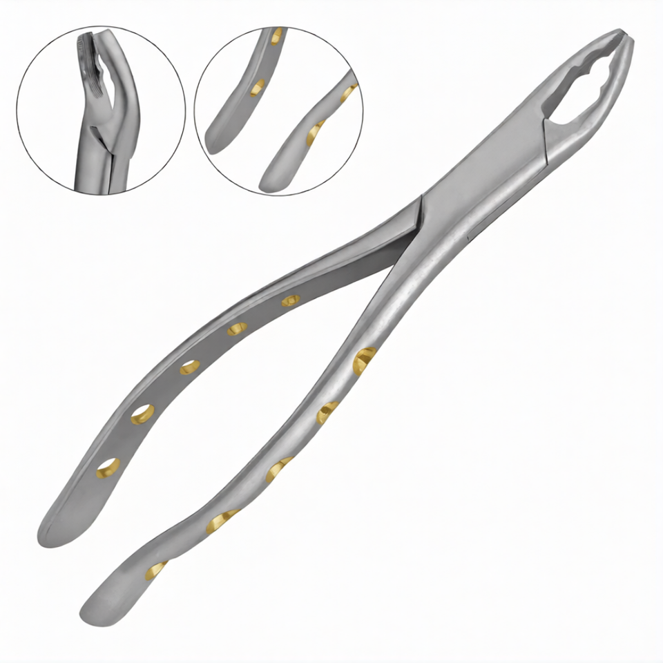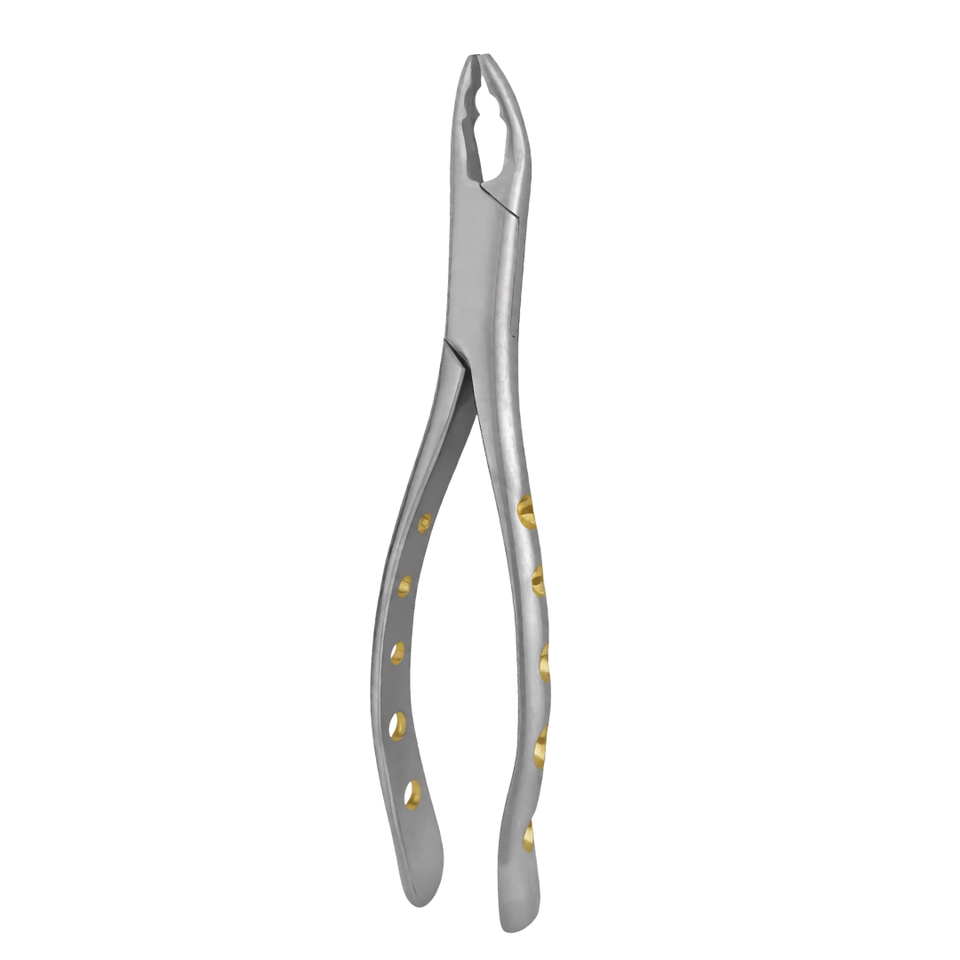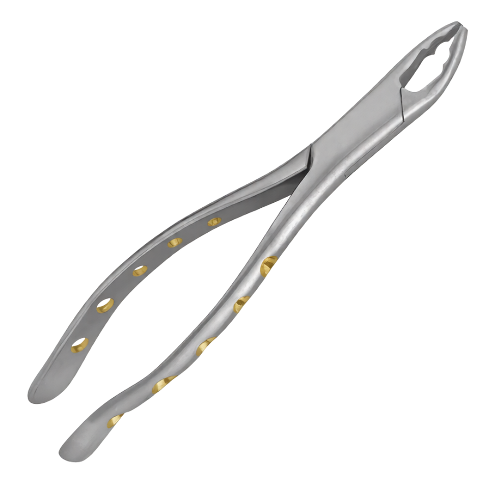 คีมถอนฟัน # ด้ามจับแบบกลวงเคลือบทองฝังเพชร 150AS พร้อมด้ามจับแบบไพธอน ผลิตจากสแตนเลสสตีล ใช้งานด้วยมือ ได้รับการรับรองมาตรฐาน CE สำหรับการผ่าตัด
