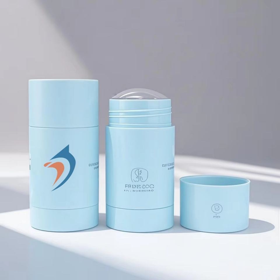 หลอดเจลระงับกลิ่นกายแบบหมุนขึ้นได้ ผิวสัมผัสยางด้าน สีฟ้า บรรจุภัณฑ์เปล่าสำหรับแท่งระงับกลิ่นกายแบบแท่ง หลอดพลาสติกทรงกลมสำหรับแท่งรองพื้น