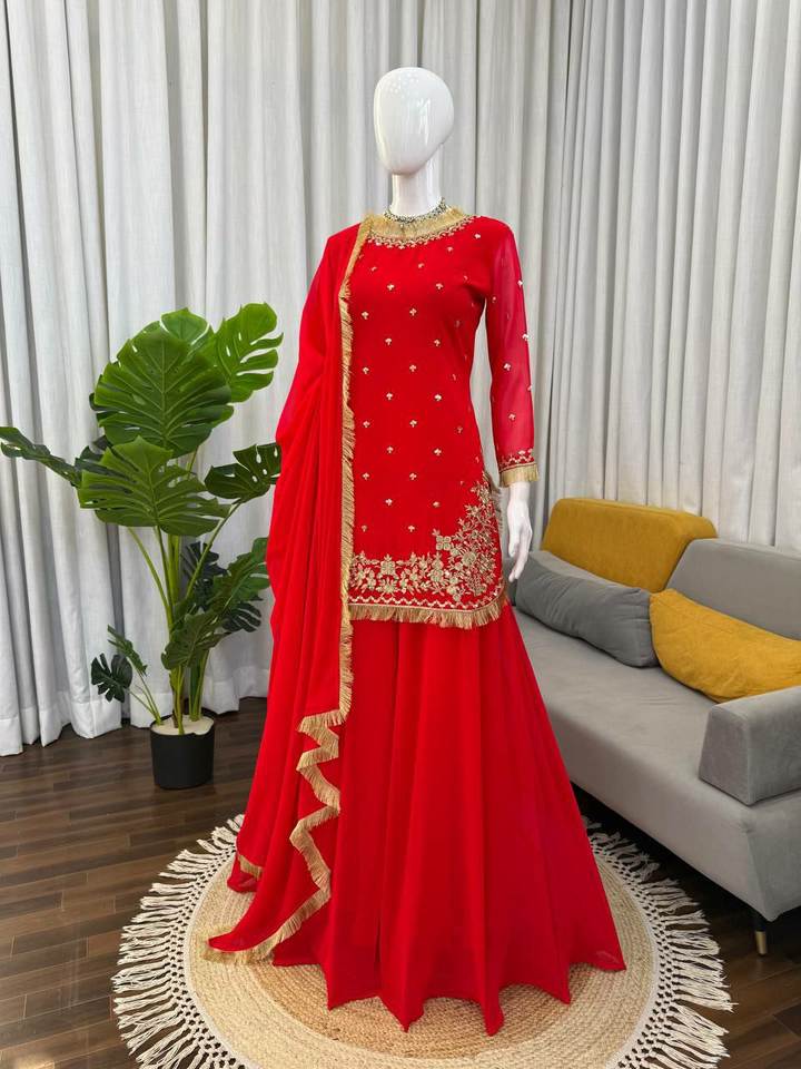 ชุดสาหรี่กะมีซแบบดั้งเดิมสำหรับผู้หญิงชาวเดซีและผู้หญิงเพื่อสุขภาพ สีแดงพิเศษ ทำจากผ้าจอร์เจตต์เทียม ประดับด้วยด้ายและเลื่อม พร้อมงานปักลูกไม้แฟนซี