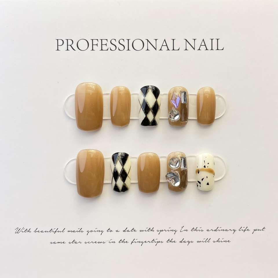 Design #448 High Quality 10pcs Press Ons Set Hand Painting Check Pattern Artificial Handmade Short Square Nail Tips for Girls