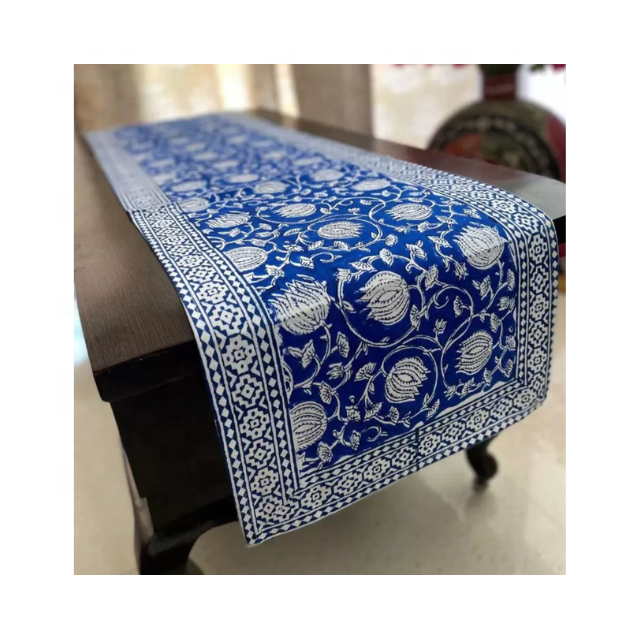 ผ้าปูโต๊ะลายดอกไม้สีน้ำเงินปักลายชนเผ่า ดีไซน์ทันสมัย ผลิตจากผ้าฝ้าย 100% ความหนาแน่น 200 GSM ขนาด 96 นิ้ว ผลิตในอินเดีย รับผลิตแบบ OEM ODM มาตรฐาน ISO จัดส่งผ่าน DHL