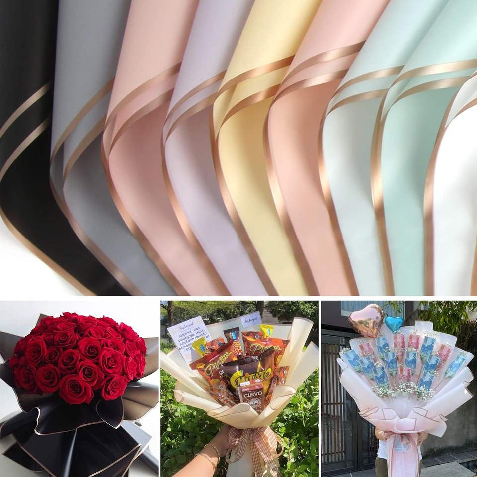 กระดาษห่อดอกไม้แบบกันน้ำพร้อมกรอบพลาสติกสีทองสำหรับขายส่ง ออกแบบได้ตามต้องการสำหรับห่อช่อดอกไม้เป็นของขวัญ
