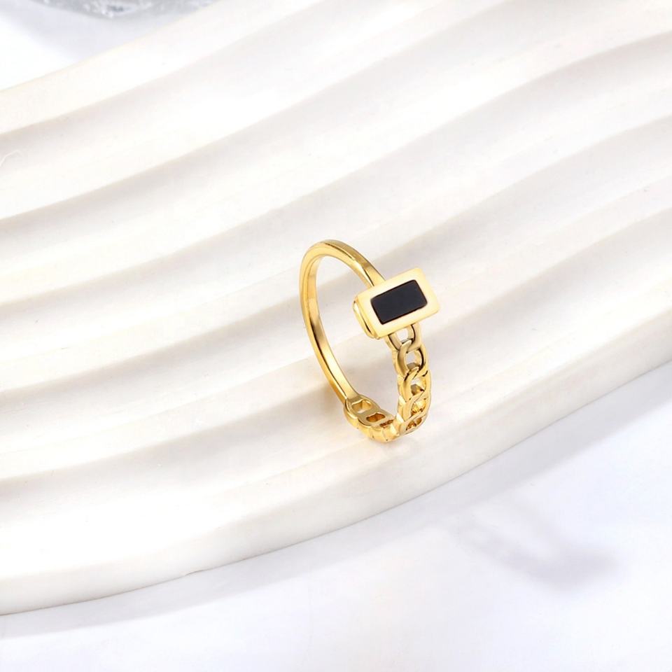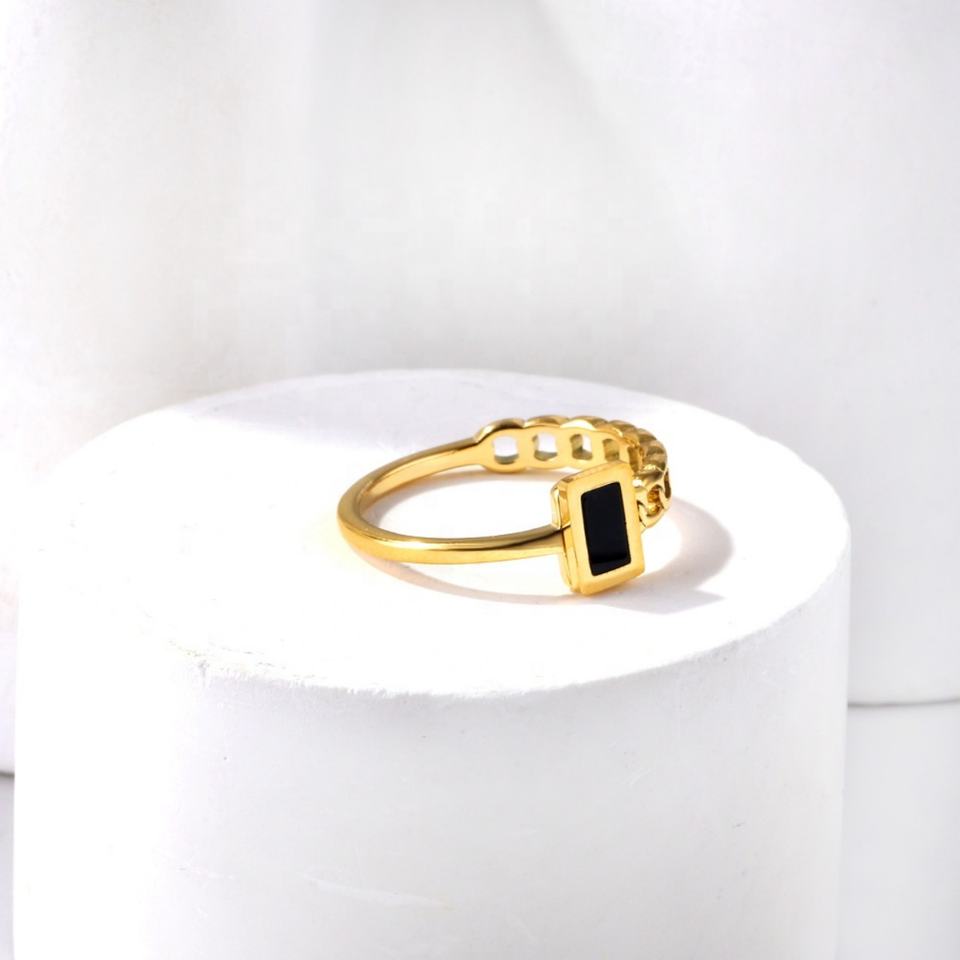 ออกแบบเครื่องประดับขายส่ง แหวนสแตนเลสชุบทอง 18K ประดับเปลือกหอยสีดำครึ่งวง แหวนสแตนเลสเคลือบสีสี่เหลี่ยม
