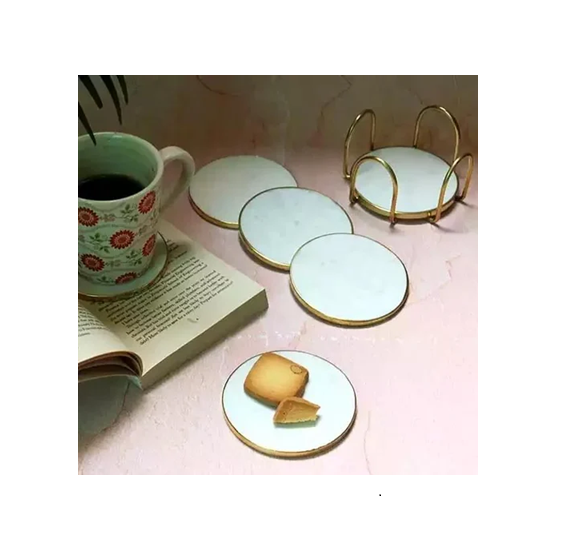 ที่รองแก้วหินอ่อนธรรมชาติพร้อมที่วางทองเหลืองโต๊ะกาแฟในบ้านถาดรองแก้วตกแต่ง