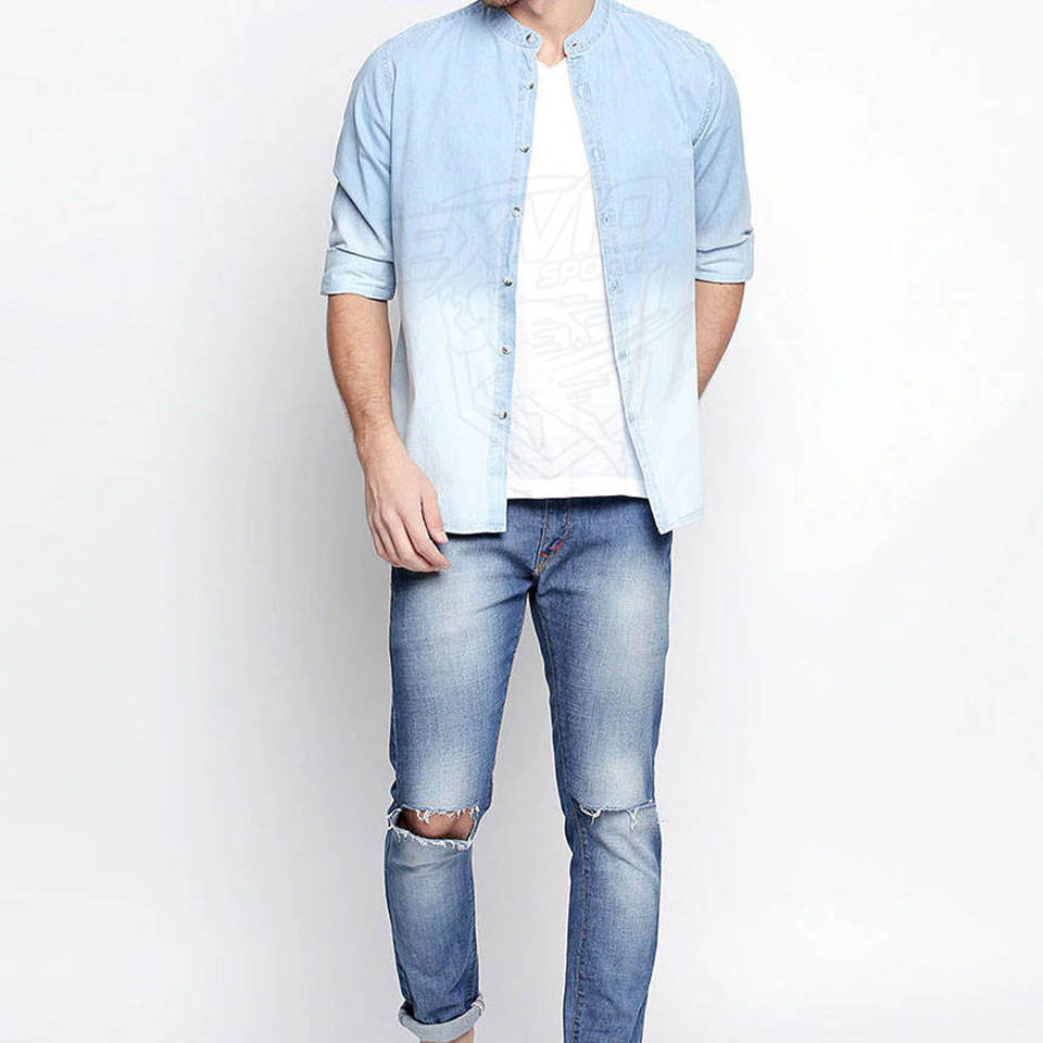 ออกแบบเสื้อเชิ้ตยีนส์แขนยาวผู้ชายของคุณเอง รับผลิตตามแบบ OEM เสื้อเชิ้ตยีนส์ระบายอากาศสั่งทำพิเศษ