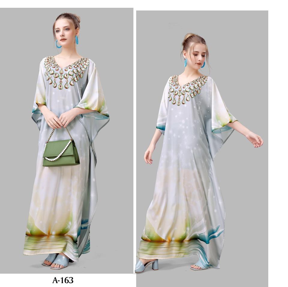ผ้าเครปโพลีเอสเตอร์ความยาวถึงพื้นพิมพ์ลายคาฟตันแบบอินเดียพิเศษสำหรับผู้หญิงทันสมัยล่าสุด