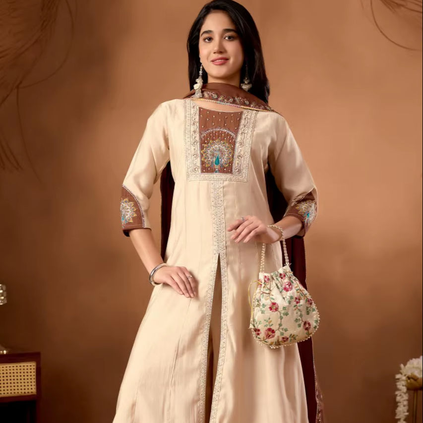 ชุดสูท anarkali ดีไซเนอร์ผ้าไหมโรมันพร้อมงานปักด้วยมือ