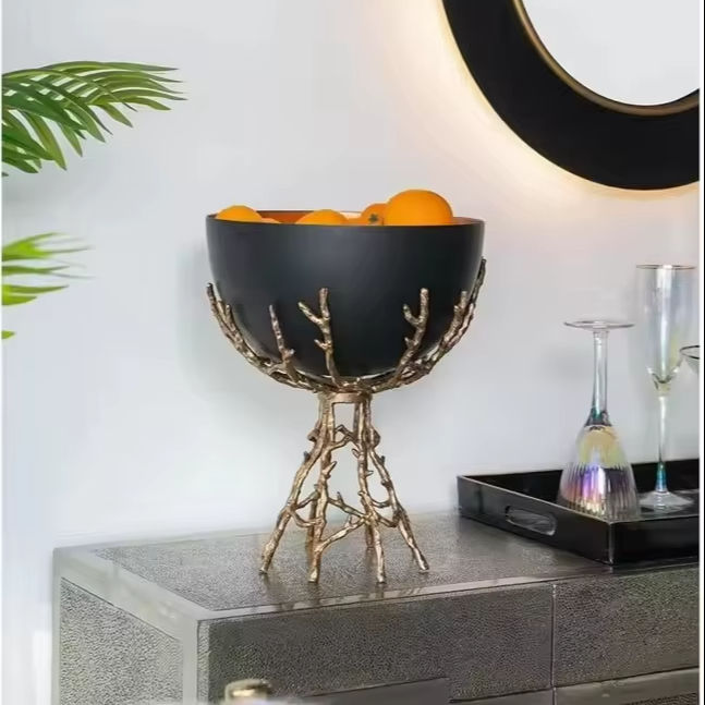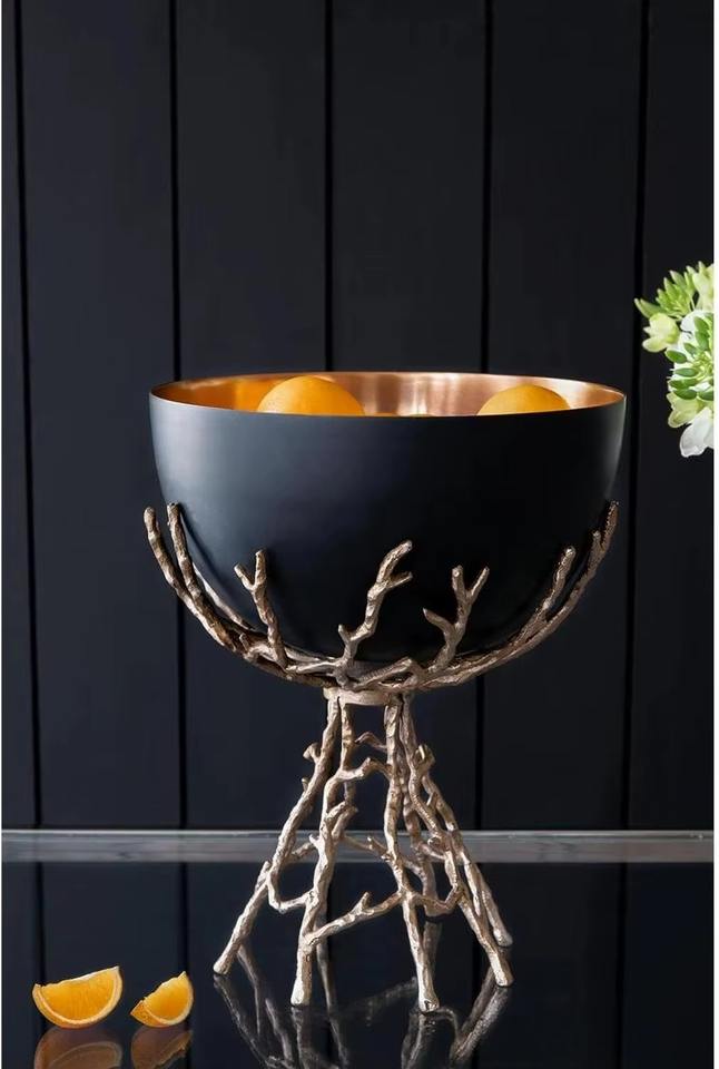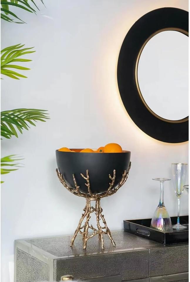 ชามตกแต่งโลหะสีดำดีไซน์เนอร์ พร้อมฐานกิ่งไม้สีทองสไตล์ศิลปะ เหมาะสำหรับวางผลไม้บนโต๊ะและใช้สำหรับต้อนรับแขก นำเข้าจากอินเดีย