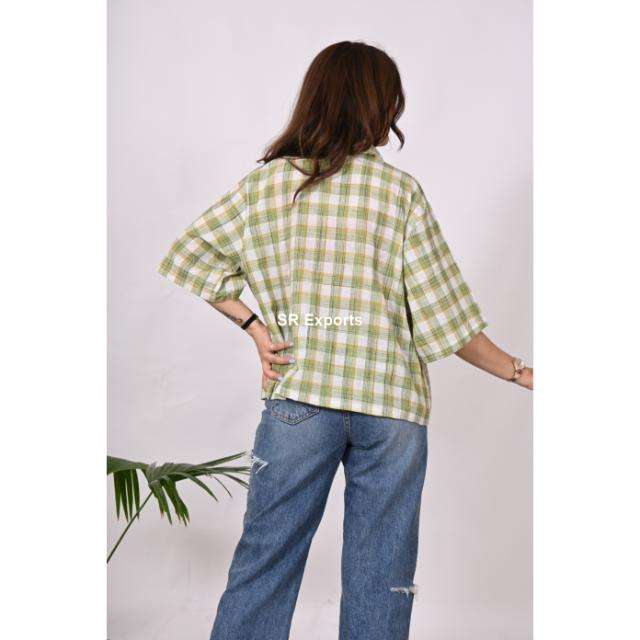 เสื้อเบลาส์ผ้าฝ้ายสำหรับผู้หญิงดีไซน์เนอร์เสื้อเชิ้ตลายตารางสไตล์ธุรกิจทรงหลวมลายตารางหมากรุกสีเขียวสำหรับฤดูร้อนขายส่ง