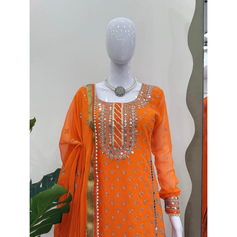 ชุดนักออกแบบที่มีบนล่างและ dupatta ปรับปรุงโดยด้ายและลำดับการทำงาน