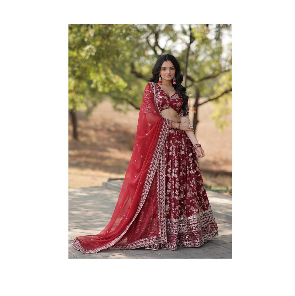 ชุด lehenga choli ผ้าแจ็คการ์ดแท้ย้อมสีสำหรับส่งออกจากอินเดีย