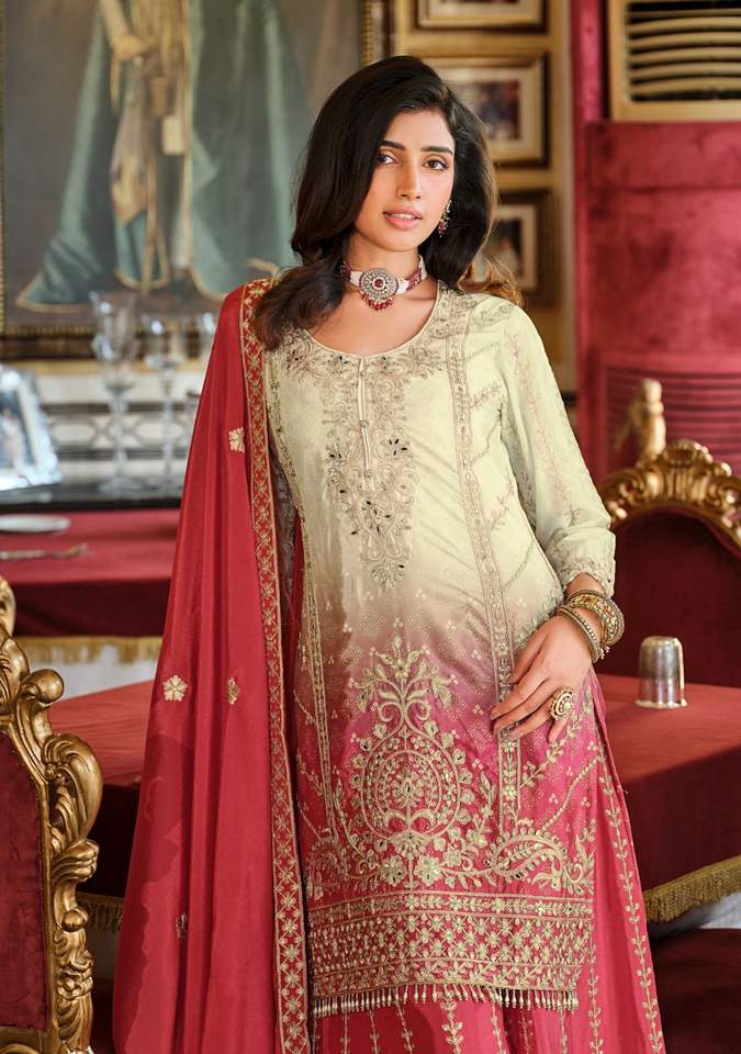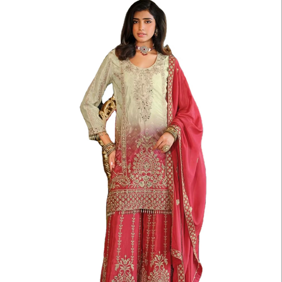 ชุดคุर्ตาทรงตรง คอทรงกลม ปักลายชนเผ่า พร้อมชาราราและผ้าคลุมไหล่
