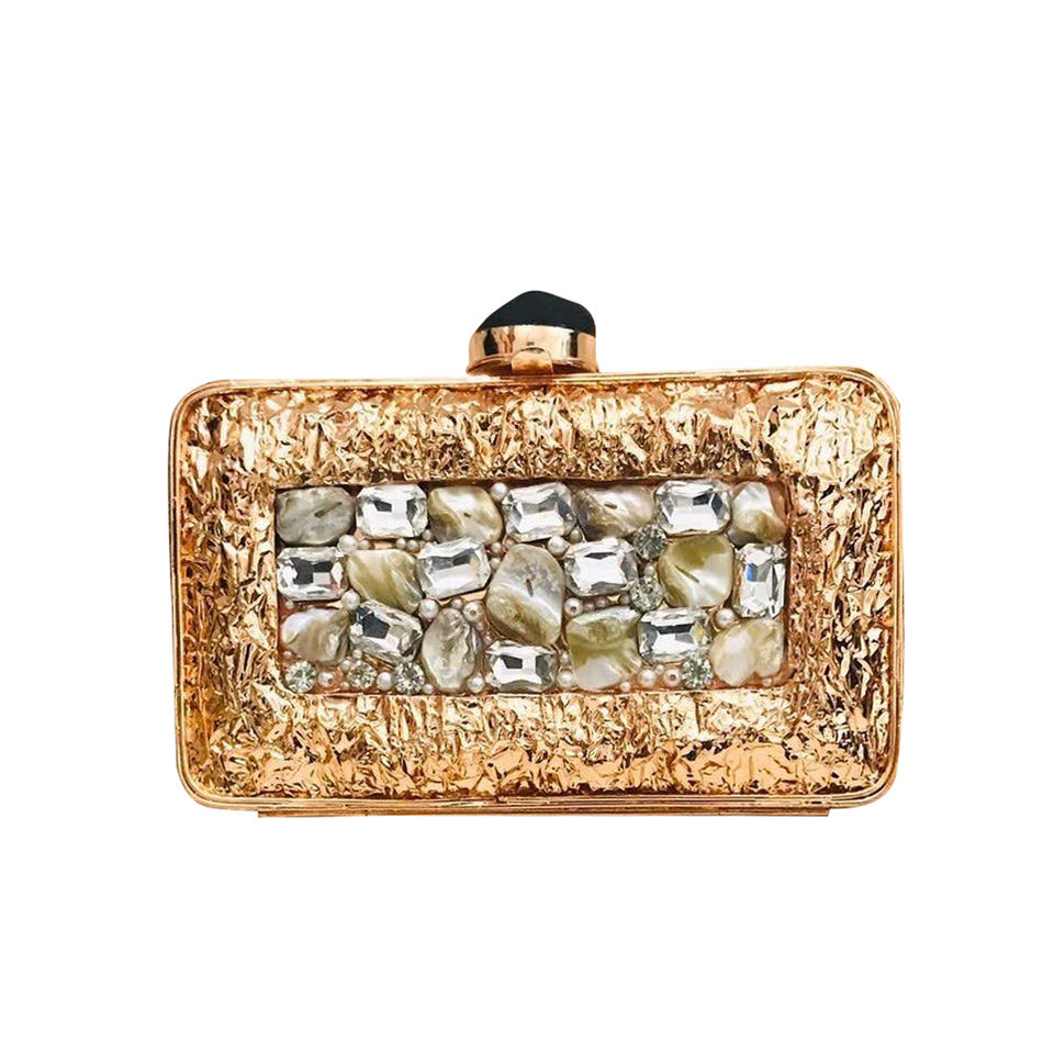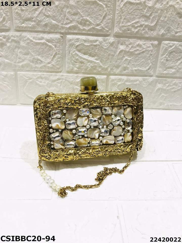 คลัทช์ตอนเย็นของนักออกแบบประดับด้วยหินคริสตัล ทองเหลืองแม่มุก การผสมผสานที่ไร้ที่ติของความช่างศิลปะและความซับซ้อน