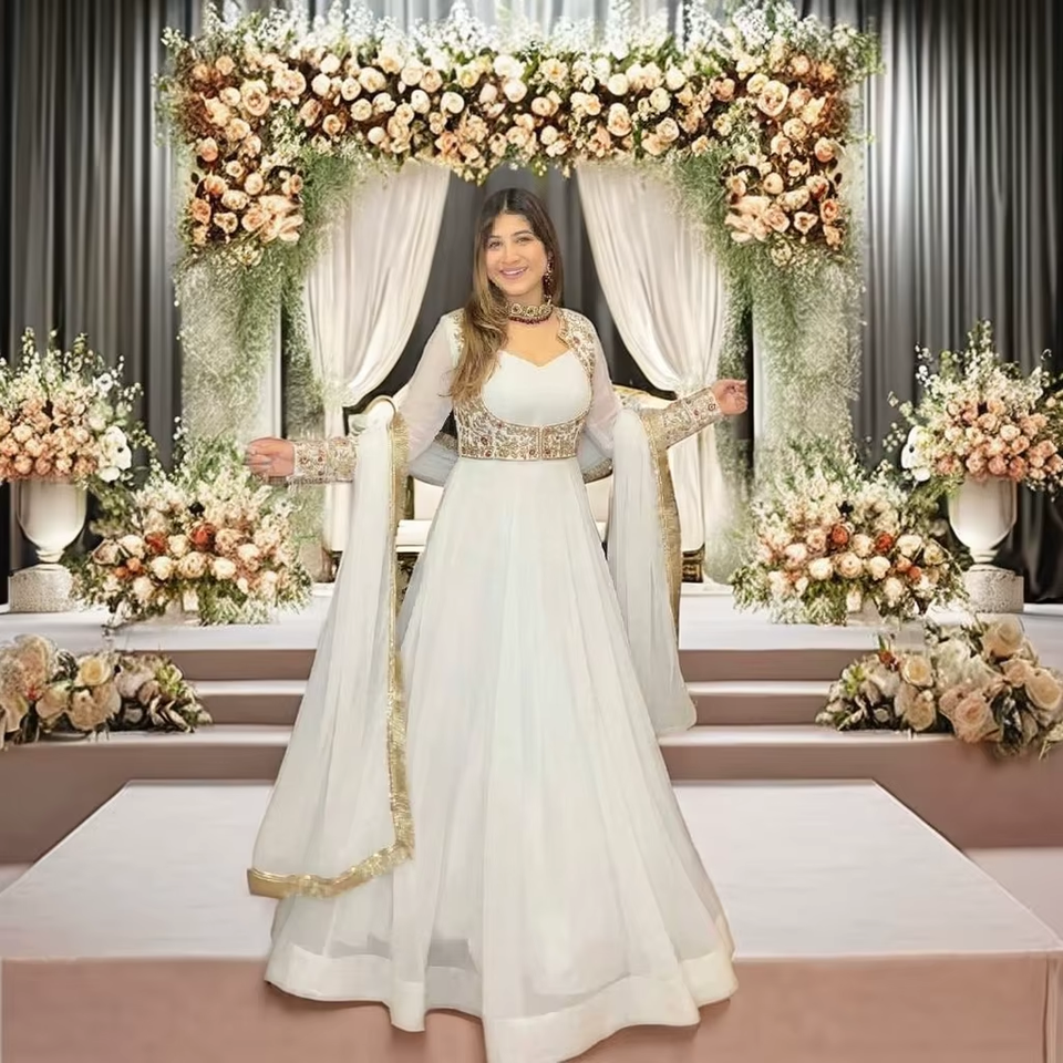 ชุดอานาร์กาลีผ้าจอร์เจตต์เทียมแบบดีไซเนอร์ ตกแต่งด้วยงานปักแบบโคติ ความยาวปกติ แห้งเร็ว ใส่ได้ทุกฤดู เหมาะสำหรับงานแต่งงานและงานเฉลิมฉลอง