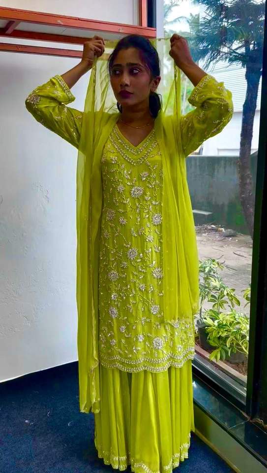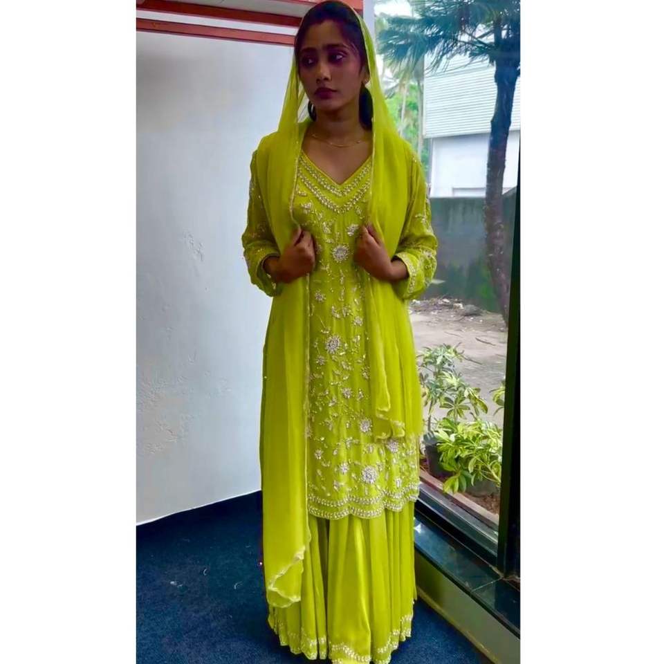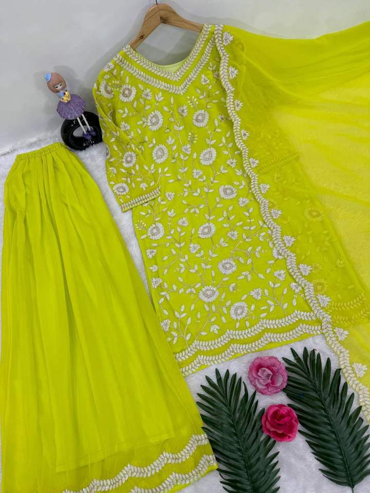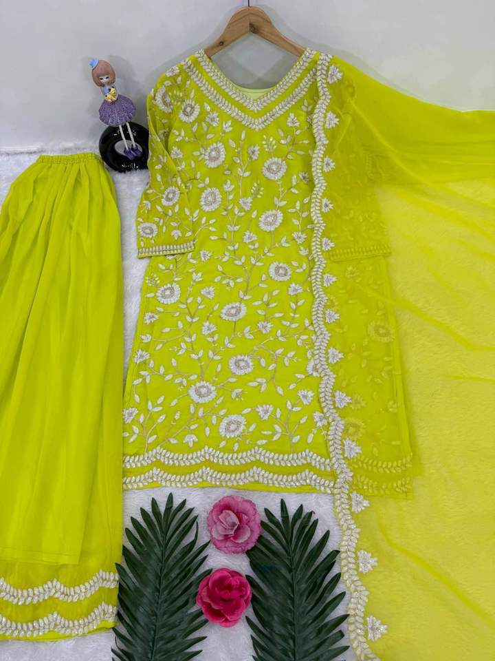 ชุดปากีสถานผ้าจอร์เจตต์เทียมลายดีไซเนอร์ งานปักเลื่อมหนักแบบจีน ตัดเย็บสำเร็จพร้อมใส่ ชุดแพลลาโซ่ ขอบกว้าง 44 มม. สำหรับชุดพื้นเมืองทั่วโลก