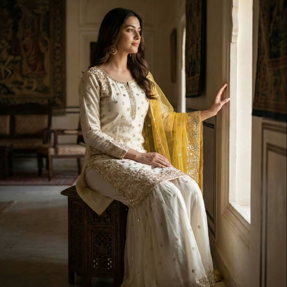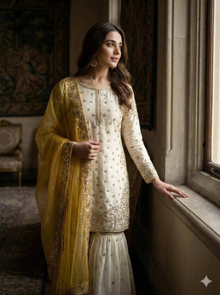 ชุดกางาร่าผ้าไหมดีไซเนอร์ Fendy สำหรับผู้หญิง – ชุดซัลวาร์ คามีซปักลายหนักประดับเลื่อม พร้อมผ้าคลุมไหล่เน็ต สำหรับงานแต่งงาน